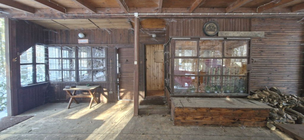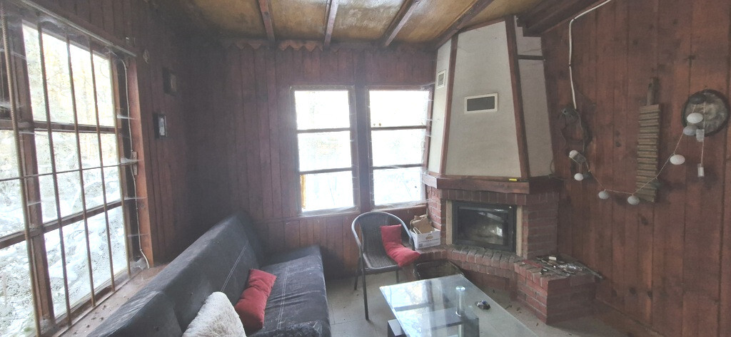Na sprzedaż uroczy drewniany domek z dużym tarasem do generalnego remontu na działce 1200 m2. Dom składa się z salonu z kominkiem, dwóch sypialni, kuchni i łazienki. Pod kuchnią jest piwnica, a do salonu przylega duży taras. Dom powstał w latach siedemdziesiątych, ale w tzw. międzyczasie dobudowana była kuchnia, piwnica, łazienka, taras, zrobiony nadmuch z kominka. Dom wymaga generalnego remontu.